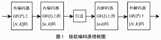 由信道編碼理論可知,隨著碼長n的增加,解碼錯誤概率以指數(shù)方式趨近于零。因此,為提高糾錯碼的有效性,就必須使用長碼。但碼長增加,碼率會相應下降,解碼設備的復雜性與計算量也相應增加,級聯(lián)碼有針對性的解決這了一矛盾。它將編碼過程分為前后串行的幾級完成,可以滿足信道糾錯對編碼長度的要求,得到與長碼相同的糾錯能力和高編碼增益;而且增加的編/解碼復雜度不是很大。其原理示意框圖如圖1所示。