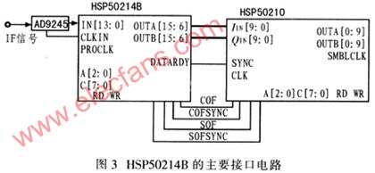 同HSP50214B直接相連器件的主要有:AD9245、HSP50210和XC4VSX55。圖3為數(shù)字下變頻器HSP50214B的主要接口電路。