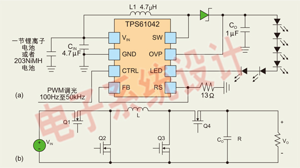 圖3:(a) 典型的白光LED驅(qū)動器的調(diào)光模式;(b) H橋接降壓/升壓轉(zhuǎn)換器電路。