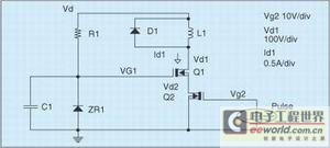 作為對(duì)用于開(kāi)關(guān)高壓MOSFET的傳統(tǒng)柵-源驅(qū)動(dòng)的一種替代,可在IC輸出中采用一種源極開(kāi)關(guān)結(jié)構(gòu)。在這種源極開(kāi)關(guān)結(jié)構(gòu)中,控制器是通過(guò)源極來(lái)驅(qū)動(dòng)外部MOSFET,而不是傳統(tǒng)PWM方法中驅(qū)動(dòng)?xùn)艠O。如圖4所示,外部MOSFET Q1的柵極通過(guò)ZR1被箝位在一個(gè)恒定電壓上,該電壓足夠高,以使晶體管充分導(dǎo)通,其典型值為14V。而電容C1(遠(yuǎn)大于柵極輸入電容)則用來(lái)在每一開(kāi)關(guān)周期暫時(shí)儲(chǔ)存柵極電荷。Q2的開(kāi)關(guān)極性與Q1同步,當(dāng)Q2打開(kāi)時(shí),Q1的源極被拉至接近于0V,而C1中所儲(chǔ)存的電荷則被傳遞到柵極,從而將Q1打開(kāi)。當(dāng)Q2關(guān)斷時(shí),Q1的漏電流繼續(xù)流向Q2。Q2漏極電壓的升高迫使Q1的柵極電容對(duì)充電電容放電。當(dāng)Q2的漏極電壓高于其柵極電壓減去Q1的柵極閥值電壓時(shí),Q1關(guān)斷。