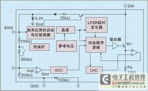采用源極開(kāi)關(guān)控制具有許多優(yōu)勢(shì)。首先,由于驅(qū)動(dòng)及檢流共用一個(gè)引腳,故能減少一個(gè)引腳,從而簡(jiǎn)化IC封裝;其次,由于IC的柵極驅(qū)動(dòng)器只需驅(qū)動(dòng)具有較低柵極閥值電壓的開(kāi)漏極FET,故能采用低電源電壓,而無(wú)需使用充電泵電路,典型的PWM IC要求最小10V的電源電壓,而建議的IC則只需6V,由于電源電壓較低,因此可以采用亞微米工藝來(lái)提高裸片面積使用效率;第三,開(kāi)關(guān)及啟動(dòng)電流源只需使用一個(gè)外部高壓MOSFET,而柵極控制方法則需要用另外的高壓器件來(lái)提供啟動(dòng)偏置電源。