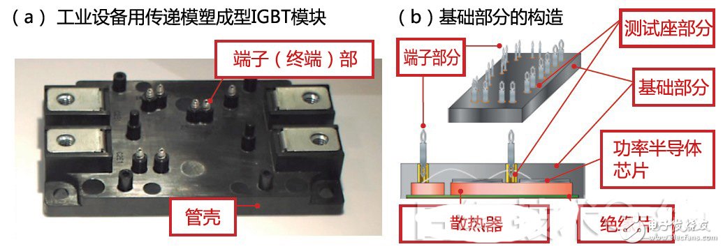 三菱電機(jī)發(fā)布了面向工業(yè)設(shè)備的注模式IGBT模塊新概念(a)。創(chuàng)造出了讓功率模塊內(nèi)的“基礎(chǔ)”部分通用、按照用途定制模塊的管殼和端子部分,從而適應(yīng)少量多品種生產(chǎn)的方法(b)。((b)為《日經(jīng)電子》根據(jù)三菱電機(jī)的資料制作)