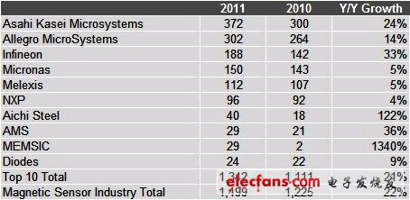根據(jù)IHS iSuppli 統(tǒng)計數(shù)據(jù),AKM的 2011年營收估計為3.72億美元,較2012年的3億美元成長24%;該公司2011年在整體磁感測器市場的占有率約為25%,穩(wěn)居自2009年首次坐上的第一大磁感測器供應商地位。2011年全球前十大磁感測器IC供應商營收總和為13億美元,占據(jù)產(chǎn)業(yè)整體營收的九成。