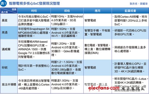 由于智慧電視與行動(dòng)裝置的晶片發(fā)展軌跡愈來愈相近,因而也吸引應(yīng)用處理器商前來搶分杯羹。