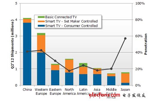 圖1 2012第二季各地區(qū)智慧電視出貨量與滲透率統(tǒng)計(jì)