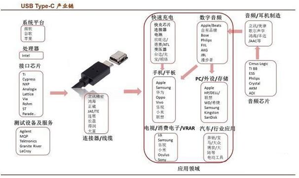 Type-C產(chǎn)業(yè)鏈:上游的芯片環(huán) 節(jié)(處理器及芯片組、接口控制芯片)系統(tǒng)平臺(tái)(微軟、谷歌、蘋果)系統(tǒng)廠(手機(jī)、電腦、平板燈)連接器/線纜廠商(端子、線材等)再到存儲(chǔ)、測(cè)試環(huán)節(jié)等。 Type-C產(chǎn)業(yè)鏈