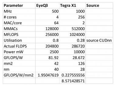 為了表示 Tegra X1 的性能到底如何,我們可以拿它和 Mobileye 的 EyeQ3 芯片做對比…