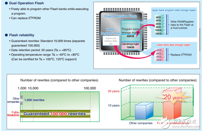 Series Features All products have built-in high reliability fl ash memory Guaranteed rewrites: Standard 10,000 times (separate guaranteed 100,000 times) Built-in “Dual Operation Flash” that can be rewritten during program execution Supports low leakage current and low power consumption, covering automotive quality Use lead-free packages that comply with the RoHS directive (Guaranteed operating temperature: Standard product -40 to +85°C, automotive -40 to +125°C)