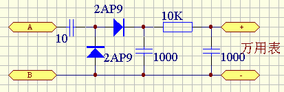 | 電路安裝好以后要進行調試,調試可以分三步進行: 1、調整各級工作點:調電阻R3使VT1的集電極電壓為1.5V(或集電極電流為1毫安左右);調整電阻R7使VT2的集電極電流為4到6毫安左右,此時用鑷子觸碰VT2的集電極,此電流應有明顯變化,說明高頻振蕩器工作正常。VT3的工作點不用調試。 2、頻率調整:打開調頻收音機,在88~108Mhz范圍內搜索本機信號。如兩機頻率對準,收音機里會產(chǎn)生劇烈的嘯叫聲,此點應避開當?shù)氐恼{頻廣播電臺所使用的頻率,避開方法是用小螺絲刀撥動線圈L1的匝距。 3、發(fā)射場強調試:先自制一個簡單的場強儀,電路如下圖。將場強儀的A、B兩點分別接無線話筒的天線端和地端,微調無線話筒的L2和L3的匝距,使場強儀的萬用表讀數(shù)最大即可。場強儀萬用表應置于直流10V或50V檔。 調整好的電路即可投入使用。 |