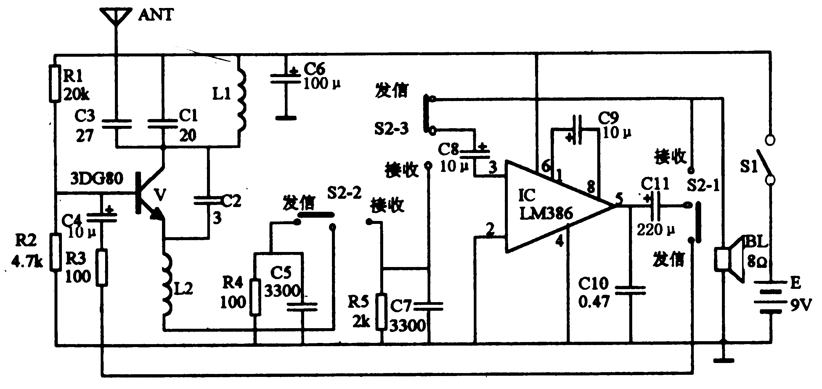 電路如圖所示。三極管V和電感線圈L1、電容器C1、C2等組成電容三點式振蕩電路,產(chǎn)生頻率約為100MHz的載頻信號。集成功放電路LM386和電容器C8、C9、C10、Cll等組成低頻放大電路。揚聲器BL兼作話筒使用。電路工作在接收狀態(tài)時,將收/發(fā)轉(zhuǎn)換開關置于“接收”位置,從天線ANT接收到的信號經(jīng)三極管V、電感線圈L1、電容器C1、C2及高頻阻流圈L2等組成的超再生檢波電路進行檢波。檢波后的音頻信號,經(jīng)電容器C8耦合到低頻放大器的輸入端,經(jīng)放大后由電容器Cll耦合推動揚聲器BL發(fā)聲。
