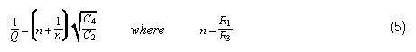 When n = 1 (i.e., when R3 = R1), the quantity (n+1/n) has a minimum value of 2. Thus, the filter capacitors will be equal-valued when Q = 1/2 and the resistors are set equal to each other. For all Qs higher than 1/2 (the most common case by far), C2 must be larger than C4. If the resistors are not equal, the ratio of C2 to C4 must be made larger. To minimize this spread in capacitor values, the resistor values should therefore be equal.![]()
