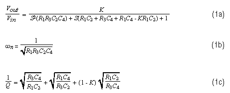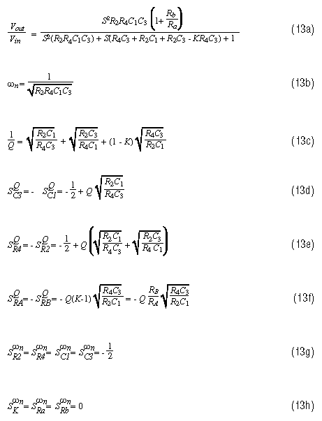 Reference 2 covers sensitivity in much greater detail, and it includes the derivations of many of the sensitivity equations listed above. References 3 and 4 also have good treatments of this important subject. These equations are so complicated that it often is quite difficult to choose the six passive components for a desired natural frequency and Q, while simultaneously achieving low-Q sensitivities, unless you play around with the equations and notice some interesting things that happen when the gain (K) is set to 1.