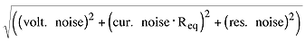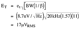 Because the effective noise bandwidth of a single-pole filter is 1.57 times the -3dB corner frequency, the MAX4256's noise bandwidth is GBW/1.57AV. In addition to voltage-noise and current-noise sources in the IC, each resistor in the circuit contributes a noise voltage. Thus, the total equivalent input-referred noise is: