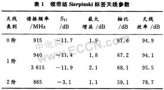 的輸入阻抗共軛匹配,以使得標(biāo)簽芯片能夠最大限度地獲得射頻識(shí)別讀寫(xiě)器所發(fā)出的電磁能量。此外,標(biāo)簽天線設(shè)計(jì)時(shí)還必須考慮電子標(biāo)簽所應(yīng)用的場(chǎng)合,如應(yīng)用在金屬物體表面的標(biāo)簽天線和應(yīng)用在普通物體表面的標(biāo)簽天線在天線的結(jié)構(gòu)