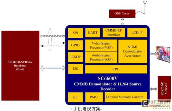 3015 全集成方案,包括解調(diào)器、視音頻解碼器等,如展訊公司的SC6600V,集成度很高,但是應(yīng)用處理器的選擇受限,尤其對(duì)于已有AP的智能手機(jī)來(lái)說(shuō),并非最優(yōu)的選擇。筆者從體積、功耗、成本和需求等方面考慮,采用思亞