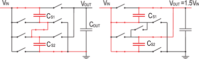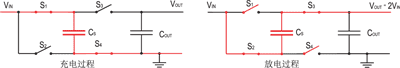 ??? 電容式驅(qū)動(dòng)拓?fù)浣Y(jié)構(gòu)的主要貯能元件是電容,按照負(fù)載端的要求可以產(chǎn)生1倍、1.5倍或者2倍于輸入的輸出電壓,從圖3到圖5分別是它們的工作原理。