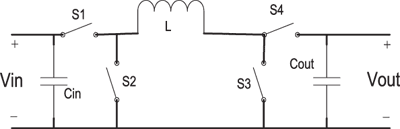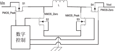 ??? 電感式結(jié)構(gòu)的主要貯能元件是電感,輸出電壓可以通過控制一個(gè)周期內(nèi)的充放電的占空比,來達(dá)到線性調(diào)節(jié),圖7所示為一個(gè)能夠自適應(yīng)實(shí)現(xiàn)升壓或降壓的拓?fù)浣Y(jié)構(gòu),它的工作原理是:(1)S1和S3閉合,升壓模式,電感兩端的電壓等于輸入電壓;(2)S1和S4閉合,前向?qū)J?,電感兩端的電壓等于輸入電壓減去輸出電壓;(3)S2和S4閉合,降壓模式,電感兩端的電壓等于反向輸出電壓。