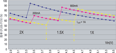 ??? 其中M是電壓變化倍數(shù)。圖6所示為在不同設(shè)定電流處,在這幾種倍數(shù)關(guān)系時(shí)效率的變化曲線。假定輸入電壓為3.6V,輸出電壓為3.5V,如果采用2倍升壓,則效率僅有50%,如果1.5倍升壓則效率只有65%,而1倍升壓的效率可以達(dá)到97%以上。