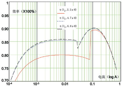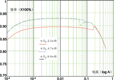??? 綜合升壓和降壓的仿真結(jié)果可以得出,在2MHz的開關(guān)頻率和MOS管的設(shè)計(jì)內(nèi)阻近似為0.17Ω條件工作時(shí),貯能電感的取值范圍可以小于4.7μH,由圖中可以看出,在一般情況下2.2μH甚至1.5μH都是可以接受的,這就意味著不但降低了成本,而且還可以在PCB設(shè)計(jì)中節(jié)省布局空間。
