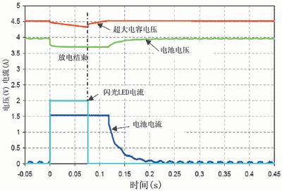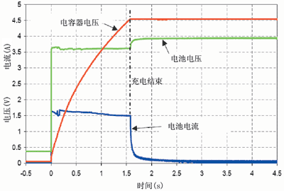 ??? 對(duì)于這種新型結(jié)構(gòu)的工作原理,首先通過電容式或電感式結(jié)構(gòu)設(shè)計(jì)的限流器來對(duì)超大電容充電,當(dāng)大功率耗電模塊,如高亮度LED和射頻功率放大器,在短時(shí)間內(nèi)需要很大的驅(qū)動(dòng)電流工作時(shí),能量主要由超大電容來提供,當(dāng)然這種結(jié)構(gòu)的局限性在于,還是無法長時(shí)間地工作在大電流狀態(tài),圖11是以電感式結(jié)構(gòu)作為限流器,采用圖10所示電流控制的超大電容結(jié)構(gòu)充電和一次完整的放充電過程。從圖中的充電過程可以看出,在限流器控制下,超大電容獲得能量并且電位得到提高,使驅(qū)動(dòng)能力得到保證;當(dāng)需要快速放電時(shí),限流器本身又作為驅(qū)動(dòng)源和超大電容一起對(duì)負(fù)載輸出能量,完成一個(gè)工作周期后超大電容再次被充電獲得能量。這樣最大程度地保障了電池使用的安全和系統(tǒng)的穩(wěn)定。