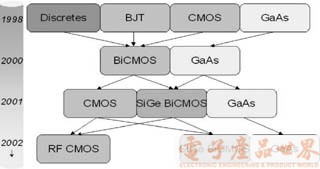 就未來發(fā)展高集成度(integration level) RF IC芯片組而言,由于Si-CMOS、SiGe電路的重復(fù)性與一致性較GaAs制程高,且單位面積的電路密度高,就電路的集成度、易產(chǎn)性及成本,目前商用RF IC以CMOS、SiGe制程具備較佳的競爭力。若從個別組件的發(fā)展來看,SiGe制程將成為PA與Switch等射頻前端組件在GaAs制程外的另一種選擇;而收發(fā)器與LNA等組件則將出現(xiàn)SiGe與CMOS搶占Si BiCMOS制程市場的局面。