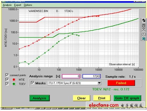 對(duì)CESoPSN芯片來說指標(biāo)和穩(wěn)定性是最重要的,而除了芯片方案本身的穩(wěn)定性外,其適應(yīng)網(wǎng)絡(luò)的能力是其穩(wěn)定性的一個(gè)重要體現(xiàn),具體就該款芯片而言主要體現(xiàn)在適應(yīng)數(shù)據(jù)包在分組網(wǎng)上抖動(dòng)(PDV)的能力和指標(biāo),目前G.8261對(duì)此有詳盡的要求,同時(shí)G.8261的要求也是中國移動(dòng)根據(jù)幾年來使用PTN網(wǎng)絡(luò)心得新近作出的招標(biāo)必須要求,目前SW2016F是市面上所知唯一測(cè)試通過G.8261模板的芯片方案,并且因其通過G.8261不同模板時(shí)無需更換代碼和作任何設(shè)置而具備測(cè)試和真正的工程意義,下面就將其網(wǎng)絡(luò)業(yè)務(wù)流模型2測(cè)試模板1和模板2的測(cè)試截圖附上,之所以附這兩個(gè)截圖是因?yàn)槟0?和模板2是目前業(yè)內(nèi)最難同時(shí)通過的兩個(gè)模板,成都朗銳芯公司也是基于對(duì)PDV及其算法多年的研究和積累方才在業(yè)內(nèi)率先實(shí)現(xiàn):