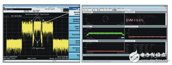 上圖右上方軌跡使用 89600 VSA 軟件生成。它解調(diào) LTE 信號并計(jì)算出 EVM 為 0.6%,這表明 FBMC 帶外特性對包含此陷波的 LTE 信號影響極小。