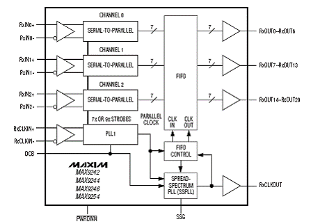 The MAX9242/MAX9244/MAX9246/MAX9254 deserialize three LVDS serial-data inputs into 21 single-ended LVCMOS/ LVTTL outputs. A separate parallel-rate LVDS clock provides the timing for deserialization. The MAX9242/ MAX9244/MAX9246/MAX9254 feature spread-spectrum capability, allowing the output data and clock frequency to spread over a specified range to reduce EMI. The single- ended data and clock outputs are programmable for a frequency spread of ±2%, ±4%, or no spread. The spread-spectrum function is also available when the MAX9242/MAX9244/MAX9246/MAX9254 operate in non- DC-balanced mode. The modulation rate of the spread is 32kHz for a 33MHz LVDS clock input and scales linearly with frequency. The single-ended outputs have a separate supply, allowing +1.8V to +5V output logic levels.
