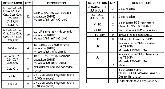 The MAX9209/MAX9244 evaluation kit (EV kit) provides a proven design to evaluate the MAX9209 21-bit programmable DC-balanced serializer and the MAX9244 21-bit deserializer with programmable spread spectrum and DC balance. The MAX9209 serializes 21 bits of LVCMOS/LVTTL parallel input data to three LVDS outputs.