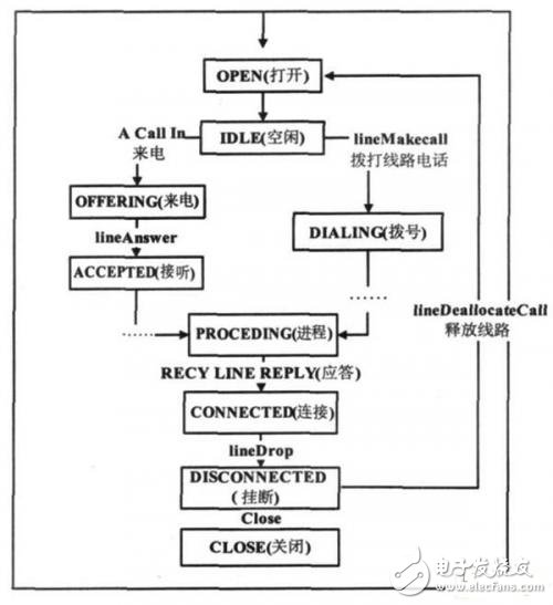 TAPI初始化成功后,應(yīng)用程序就和TSP設(shè)備建立了聯(lián)系。應(yīng)用程序就可以通過TAPI函數(shù)控制電話線路、監(jiān)控線路狀態(tài)。函數(shù)lineOpen調(diào)用成功后進(jìn)入消息循環(huán),新生成的呼叫處于IDLE狀態(tài),隨后根據(jù)狀態(tài)指令執(zhí)行不同的操作。當(dāng)調(diào)用lineM akeC all( )后,線路狀態(tài)進(jìn)入D IAL ING、PROCEDING,當(dāng)收到異步響應(yīng)或者應(yīng)答后進(jìn)入呼叫狀態(tài)循環(huán)并依次進(jìn)入CONNECTED和DISCONNECTED,最后回到初始化狀態(tài)。當(dāng)有一路電話呼入時(shí),線路狀態(tài)進(jìn)入OFFER ING、自動調(diào)用lineAnsw er( )后進(jìn)入ACCEPTED、PROCED ING,當(dāng)收到異步響應(yīng)或者應(yīng)答后進(jìn)入呼叫狀態(tài)循環(huán)并依次進(jìn)入CONNECTED和D ISCONNECTED,最后回到初始化狀態(tài),整個(gè)TAPI狀態(tài)圖如圖4所示。