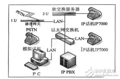 由于TAPI應(yīng)用是電訊應(yīng)用,需要連接PC電腦和通訊硬件設(shè)備,TAPI運(yùn)行在PC機(jī)上并監(jiān)控通訊硬件設(shè)備,所以首要任務(wù)是建立硬件環(huán)境。對于VOIP應(yīng)用通信系統(tǒng)來說,軟交換服務(wù)器是IP電話網(wǎng)的控制核心,同時(shí)落地接入PSTN (公共電話網(wǎng)),PC機(jī)與軟交換服務(wù)器處于同一網(wǎng)段,TAPI與硬件交互也將通過網(wǎng)絡(luò)使用TCP/ IP協(xié)議連接。本設(shè)計(jì)的開發(fā)平臺是基于如下軟交換系統(tǒng),系統(tǒng)如圖1所示。