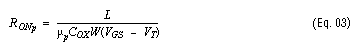 The on-resistance curves are determined by the length L, width W, electron and hole mobility (μn and μp, respectively), oxide capacitance COX, threshold voltage VT, and signal voltage VGS (VIN) of both MOSFETs.