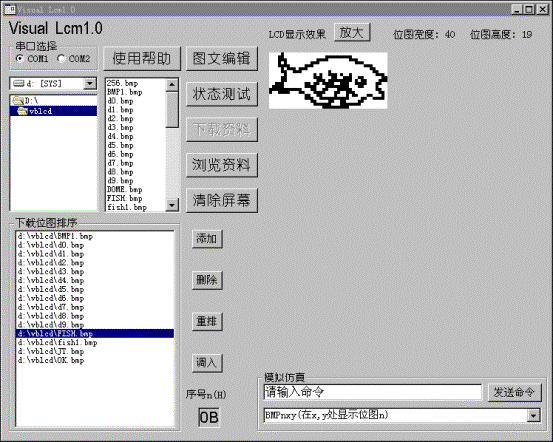 ?????? 在主畫面的“發(fā)送命令”左邊的命令輸入框中輸入正確的命令后點(diǎn)擊“發(fā)送命令”,此時(shí)LCD屏上會有相應(yīng)的顯示動作,若在調(diào)試過程中發(fā)現(xiàn)要修改某位圖時(shí)可以用“圖文編輯”