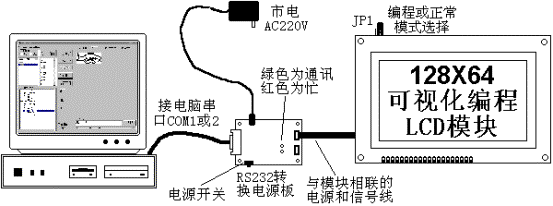 ?????? 用戶首先在電腦上完成LCD顯示界面的編輯,資料下載及仿真調(diào)試工作,所配仿真調(diào)試軟件可使用戶方便的進(jìn)行上述工作,在硬件上除可視化編程LCD模組之外還配有一塊電腦RS232電平轉(zhuǎn)換轉(zhuǎn)接板,此板負(fù)責(zé)模塊與電腦聯(lián)接和對模塊的供電,模塊與電腦聯(lián)接圖示如下。