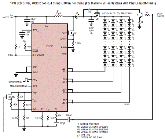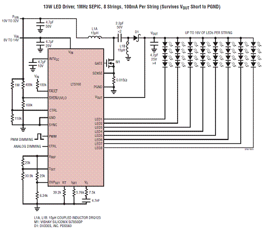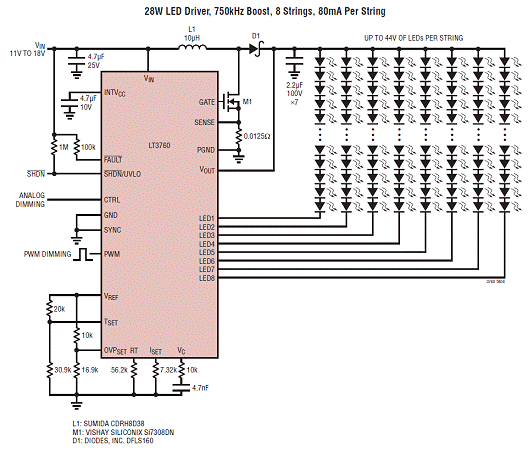 凌力爾特公司 (Linear Technology Corporation) 推出 8 通道 LED 驅(qū)動(dòng)器 LT3760,該器件采用一個(gè)升壓型 DC/DC 控制器,每個(gè)通道能