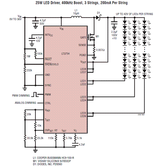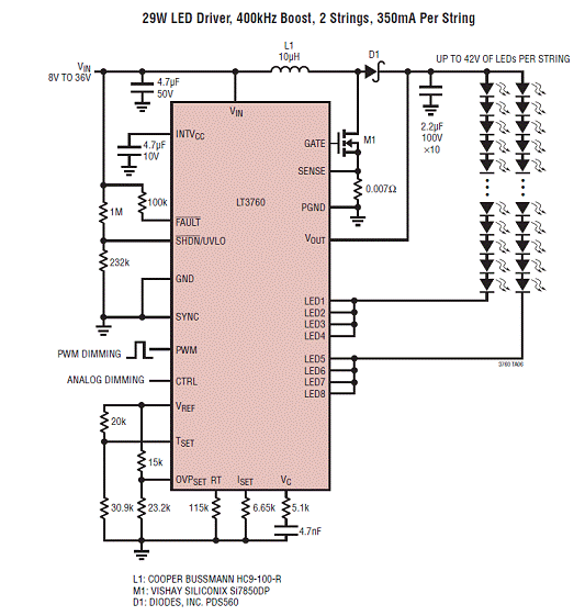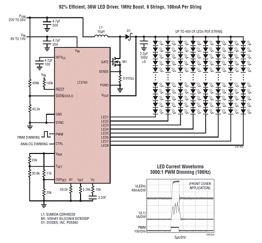 Linear 公司的LT3760是集成了升壓DC/DC控制器的 8路LED驅(qū)動(dòng)器,能驅(qū)動(dòng)高達(dá)45V的LED. 輸入電壓從6V 到 40V,40mA時(shí)的LED匹配電流為±2%,典型值為±0.7%,調(diào)光比高達(dá)3000:1,可編程的頻率從100kHz到1MHz,主