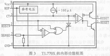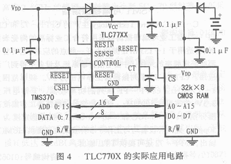 TL770X的引腳1是其內(nèi)部參考電壓的輸入端,實(shí)際應(yīng)用中一般一個(gè)0.1μF的電容以減小電源電壓瞬變的影響,而對(duì)TLC770X來(lái)說(shuō),其內(nèi)部無(wú)需電壓參考。圖2和圖3分別為T(mén)LC770X和TL770X的內(nèi)部框圖,所以TLC770X的引腳被賦予另外的功能。它可以作為靜態(tài)RAM(Static RAM)的控制信號(hào),當(dāng)其懸空時(shí)(該引腳內(nèi)部下拉),RESET的輸出是高電平,圖4是TLC77X的一個(gè)實(shí)際應(yīng)用電路,該電路在掉電期間,處理器TMS370的存儲(chǔ)塊片選信號(hào)(CSH1)輸出低電平,TLC770X的引腳1接收到這個(gè)信號(hào)后將使RESET引腳的輸出電平置為高,而RESET是連接外部存儲(chǔ)器片選端的,這就使得外部存儲(chǔ)器在掉電期間可以自動(dòng)關(guān)閉。