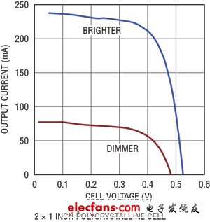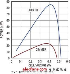 為了從光伏電池抽取最大功率,電源轉(zhuǎn)換器的輸入阻抗必須與電池的輸出阻抗匹配,從而使系統(tǒng)能在最大功率點(diǎn)上工作。圖3顯示了一個(gè)典型的單節(jié)光伏電池的功率曲線(xiàn)。為了確保抽取最大功率,光伏電池的輸出電壓應(yīng)該與功率曲線(xiàn)的峰值點(diǎn)相對(duì)應(yīng)。LTC3105 調(diào)節(jié)提供給負(fù)載的輸出電流,以保持光伏電池的電壓等于最大功率點(diǎn)控制引腳設(shè)定的電壓。因此可用單個(gè)電阻器設(shè)定最大功率點(diǎn),并確保從光伏電池抽取最大功率和峰值輸出充電電流。