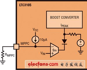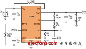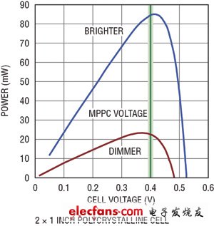 為了從光伏電池抽取最大功率,電源轉(zhuǎn)換器的輸入阻抗必須與電池的輸出阻抗匹配,從而使系統(tǒng)能在最大功率點上工作。圖3顯示了一個典型的單節(jié)光伏電池的功率曲線。為了確保抽取最大功率,光伏電池的輸出電壓應該與功率曲線的峰值點相對應。LTC3105 調(diào)節(jié)提供給負載的輸出電流,以保持光伏電池的電壓等于最大功率點控制引腳設定的電壓。因此可用單個電阻器設定最大功率點,并確保從光伏電池抽取最大功率和峰值輸出充電電流。