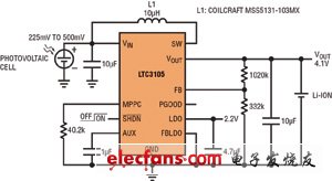 串聯(lián)連接的高壓光伏電池組能提供充足的功率,但單節(jié)光伏電池解決方案卻很少見,因為單節(jié)光伏電池在有負載情況下產(chǎn)生的電壓很低,從這么低的電壓難以產(chǎn)生有用的電源軌。幾乎沒有升壓型轉(zhuǎn)換器能從電壓很低、阻抗相對較高的單節(jié)光伏電池產(chǎn)生輸出。不過,LTC3105是專門為應對這類挑戰(zhàn)而設計。該器件具有超低的250mV啟動電壓和可編程最大功率點控制,能從富有挑戰(zhàn)性的光伏電源產(chǎn)生大多數(shù)應用所需的典型電壓軌(1.8~5V)。