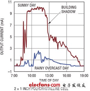利用圖6所示的LTC3105電路和一個2英寸×1英寸的多晶光伏電池給鋰離子電池充電,所測得的充電電流曲線如圖7所示。圖7中上面的曲線顯示,在天氣晴朗、陽光充足的典型情況下的充電電流;下面的曲線則顯示,在陰云密布時觀察到的充電電流。即使在這類光照量很低的情況下,在整個白天也能保持250μA或更大一些的充電電流,這相當于給電池提供了總共 6mAh 的充電。