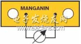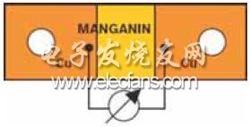 四引線設(shè)計(jì)推薦用于大電流和低阻值應(yīng)用。通常的做法使用錳鎳銅合金帶直接沖壓成電阻器(圖7),但這不是最好的辦法。盡管四引線電阻有利于改進(jìn)溫度特性和熱電壓,但總阻值有時(shí)高出實(shí)際阻值2到3倍,這會(huì)導(dǎo)致難以接受的功率損耗和溫升。此外,電阻材料很難通過螺絲或焊接與銅連接,也會(huì)增加接觸電阻以及造成更大的損耗。