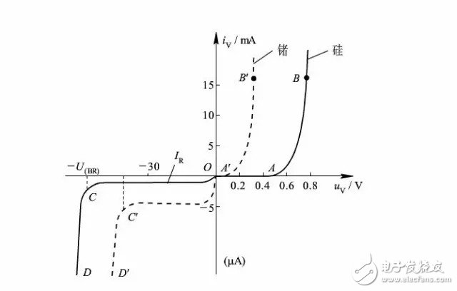 當(dāng)正向電壓超過門檻電壓時(shí),正向電流就會(huì)急劇地增大,二極管呈現(xiàn)很小電阻而處于導(dǎo)通狀態(tài)。這時(shí)硅管的正向?qū)▔航导s為0.6~0.7V,鍺管約為0.2~0.3V,如圖中AB(A′B′)段。