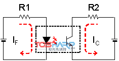 下圖顯示一個(gè)使用晶體管耦合器的普通線路。如果LED電流IF運(yùn)行至輸入端,集電器電流IC將運(yùn)行至輸出端。該電流傳輸比稱為轉(zhuǎn)換效率(CTR: 電流傳輸比)通過(guò)(IC/IF)× 100(%)表示。與晶體管的hFE一樣,轉(zhuǎn)換效率是晶體管耦合器一個(gè)重要的參數(shù)。