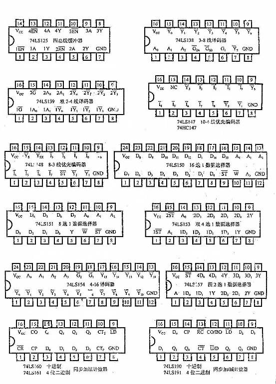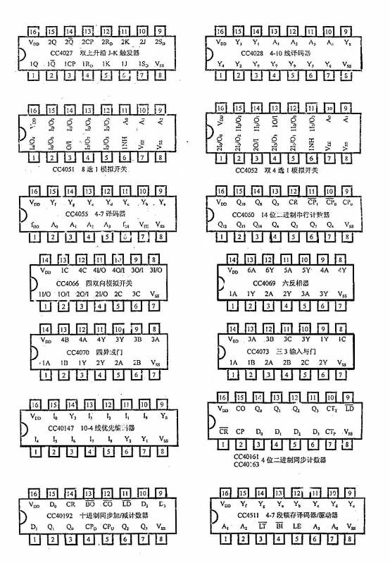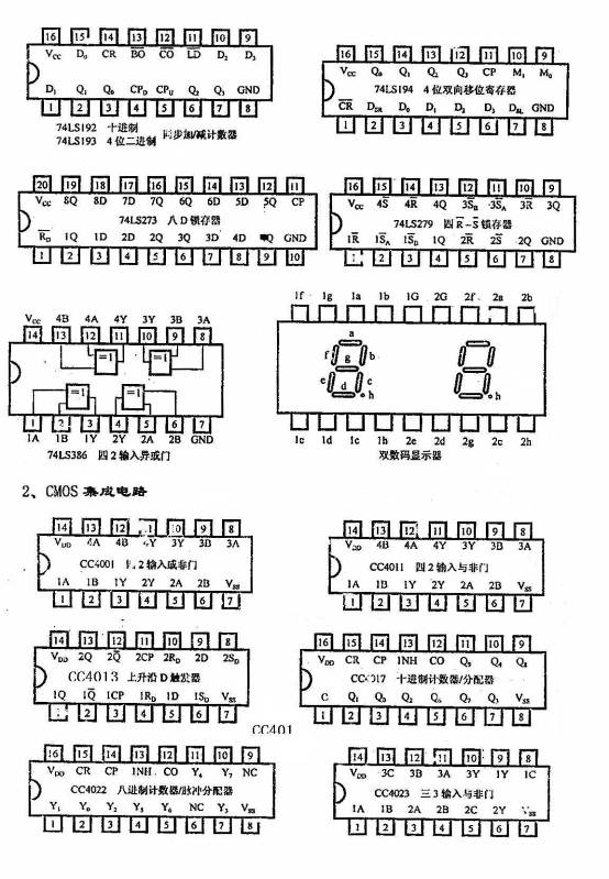 常用集成電路引腳排列圖:包括了,555定時器和TTL數(shù)字集成電路引腳排列圖,74系列集成電路引腳排列圖,CMOS集成電路引腳排列圖等.