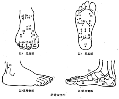 19號穴:在足背二、三趾間后3寸處。主治頭痛、中耳炎、急性慢胃腸炎、胃及十二脂腸潰瘍。