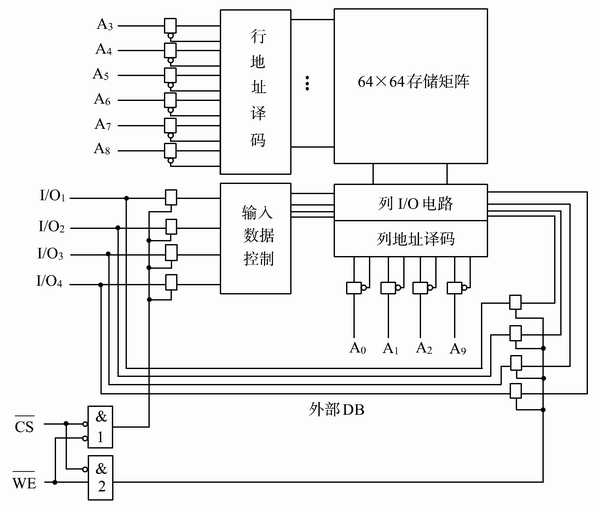 =0時,該芯片被選中。由于2114的容量為1024×4位,故有4096個基本存儲電路,排成64×64的矩陣。用A3-A8六根地址線作為行譯碼,產生64根行選擇線,用A0~A2與A9 四根地址線作為列譯碼,產生16根列選擇線,而每根列選擇線控制一組4位同時進行讀或寫操作。存儲器內部有4路I/O電路以及4路輸入/輸出三態(tài)門電路,并由4根雙向數(shù)據線I/O1~I/O4引與外部數(shù)據總線相連。當