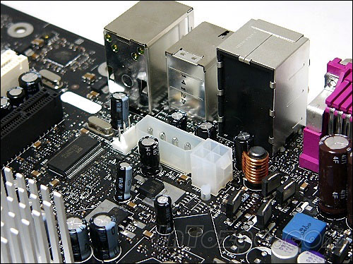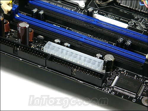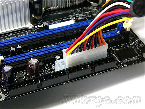 20針電源安裝到上面,會空出4個接口。如果您熟悉服務器產(chǎn)品的話應該都知道,這種24針接口電源一直用在服務器上,現(xiàn)在915/925平臺把它引進過來,應該是為了PCI Express X16接口做電源供應。根據(jù)資料來看,PCI Express X16接口最高可以應用75W功耗的顯卡,其中一部分電力應該就是由這種服務器電源額外提供的。