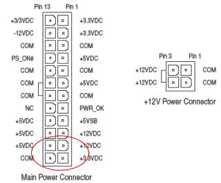 從上圖可以看出來,24針電源較20針電源分別增加了+3.3V、+5V、+12V,還有一顆地線。