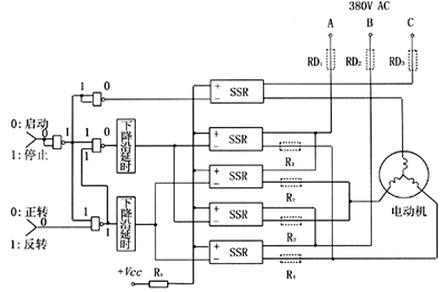 圖8 計算機控制三相交流電機正反轉的接口及驅(qū)動電路圖8計算機控制三相交流電機正反轉的接口及驅(qū)動電路,圖中采用了4個與非門,用二個信號通道分別控制電動機的起動、停止和正轉、反轉。當改變電動機轉動方向時,給出指令信號的順序應是“停止—反轉—起動”或“停止—正轉—起動”。延時電路的最小延時不小于1.5個交流電源周期。其中RD1、RD2、RD3為熔斷器。當電機允許時,可以在R1-R4位置接入限流電阻,以防止當萬一兩線間的任意二只繼電器均誤接通時,限制產(chǎn)生的半周線間短路電流不超過繼電器所能承受的浪涌電流,從而避免燒毀繼電器等事故,確保安全性;但副作用是正常工作時電阻上將產(chǎn)生壓降和功耗。該電路建議采用額定電壓為660 V或更高一點的SSR產(chǎn)品。